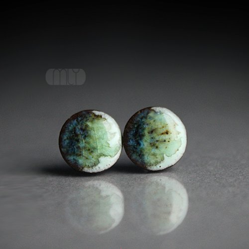 Ceramiczne okrągłe kolczyki w formie sztyftów, ręcznie wykonane z delikatnej gliny kamionkowej, jednostronnie szkliwione mieszanką zielonych szkliw z efektem plamek, na antyalergicznych sztyftach w kolorze srebrnym. Średnica ok. 9mm. Polecam