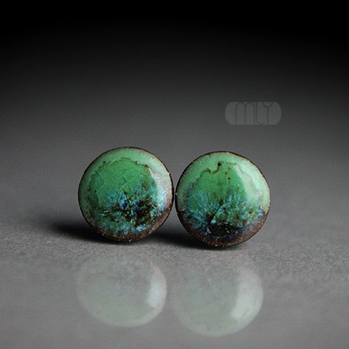 Ceramiczne okrągłe kolczyki w formie sztyftów, ręcznie wykonane z delikatnej gliny kamionkowej, jednostronnie szkliwione mieszanką zielonych szkliw z efektem plamek, na antyalergicznych sztyftach w kolorze srebrnym. Średnica ok. 9mm. Polecam