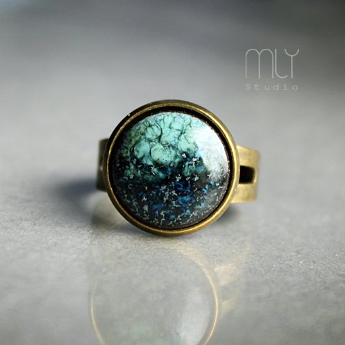 Efektowny pierścień z ceramicznym oczkiem, ręcznie wykonanym z gliny kamionkowej, poszkliwionym mieszanką szarozielonych szkliw z efektem plamek. Obrączka regulowana w kolorze starego złota, średnica oczka ok 14mm. Polecam