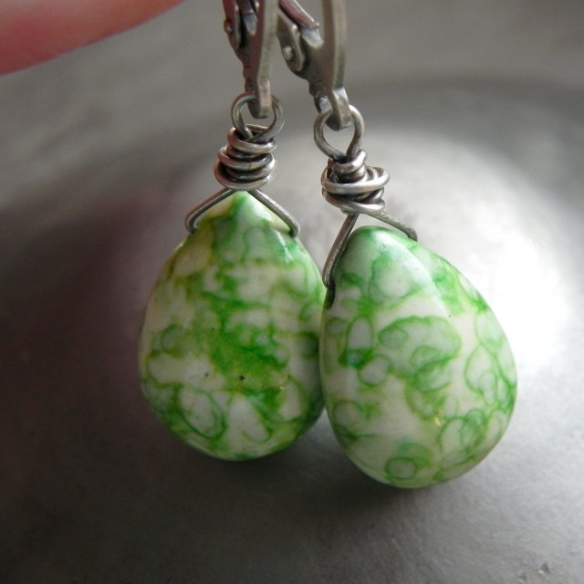 Piękne, bardzo kobiece kolczyki wykonane zostały z oksydowanego i przetartego srebra próby 925 oraz kropli howlitu - 18 mm. Długość całkowita kolczyków wynosi 4 cm.