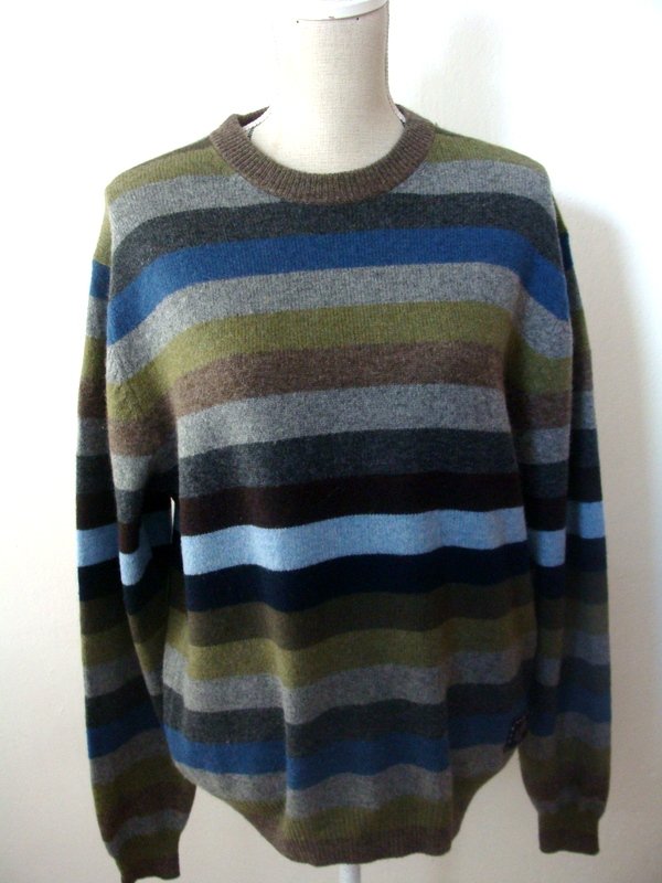 Wełniany sweter w paski w spokojnej kolorystyce zgniłej zieleni, ciemnej i jasnej szarości, brązów, błekitu, chabru i i granatu. Wykończony ściągaczami.