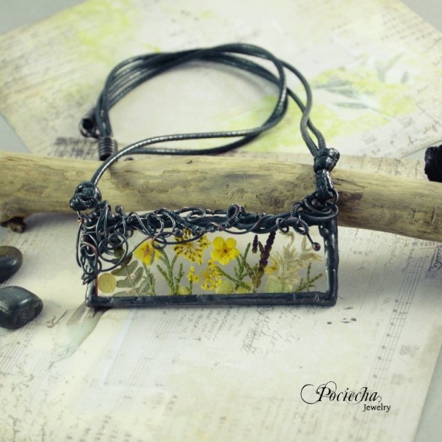 Wisior stanowi połączenie miedzi jubilerskiej ekologicznej cyny ( bez ołowiu ! ) ze szkłem w którego wnętrzu zamknęłam piękne naturalne suszone kwiaty zbierane przeze mnie w lecie :) Uroku całości dodają sploty miedziane.