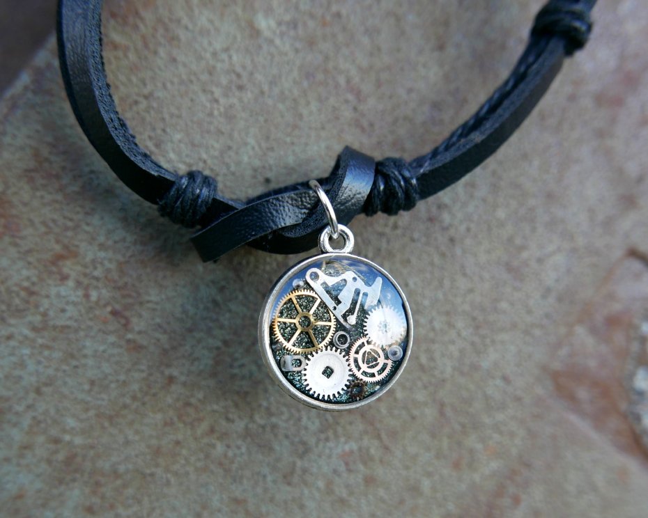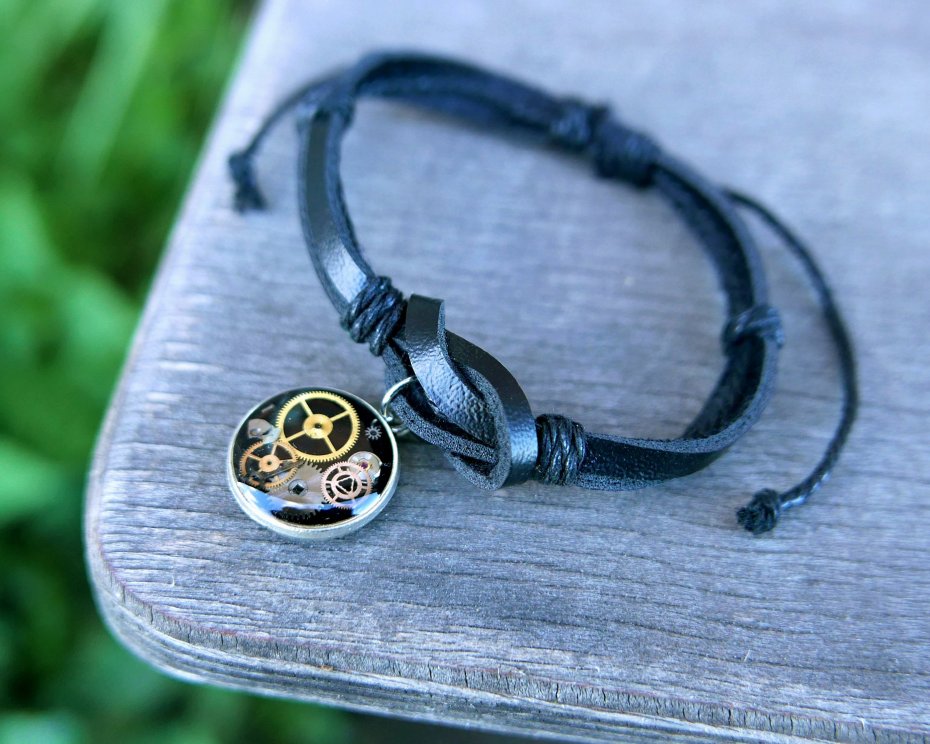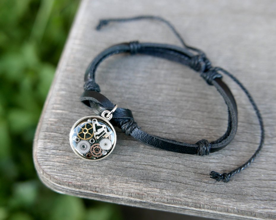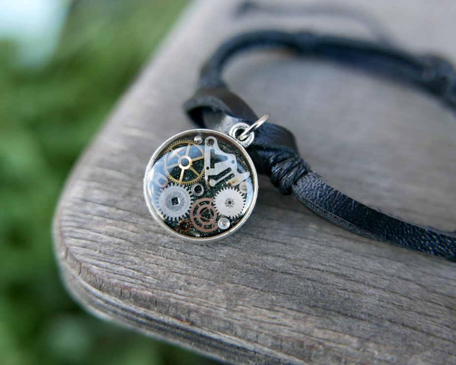 Uniseksowa bransoletka w etnicznym klimacie, łącząca rzemyki, metal oraz oryginalne części mechanizmu zegarka. Każda strona zawieszki jest w innym kolorze.