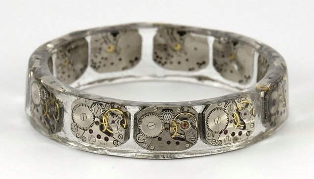 Zjawiskowa masywna bransoleta na czasie w stylu steampunk. Wykonana z żywicy i zegarkowych różności. Średnica wewnętrzna 6,7 cm, zewnętrzna 8,0 cm, szerokość 1,7 cm.