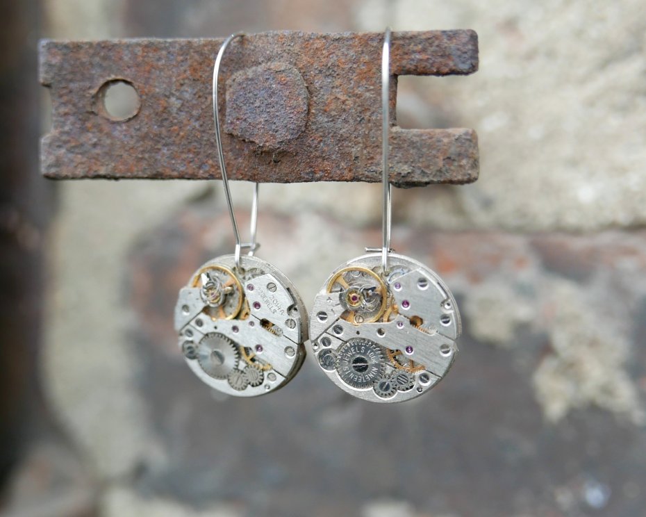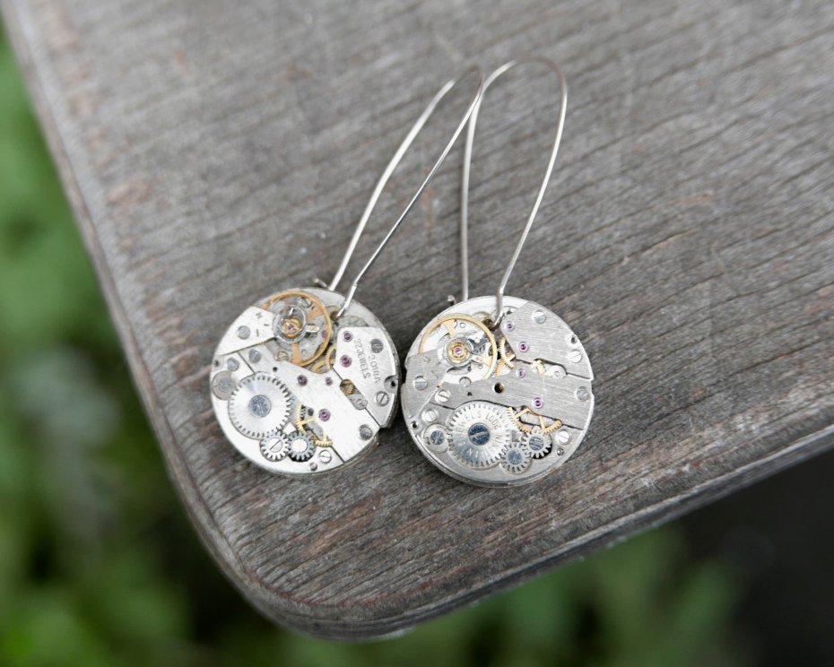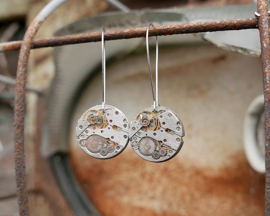 Ascetyczne kolczyki wykonane z oryginalnych mechanizmów zegarkowych w eleganckim, srebrnym wykończeniu. Idealny wybór dla osób szukających unikalnych, artystycznych dodatków.