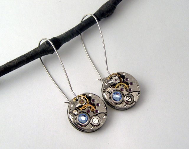 Industrialne kolczyki wykonane z oryginalnych mechanizmów zegarkowych i kryształków Swarovskiego. Idealny wybór dla osób szukających unikalnych, artystycznych dodatków.