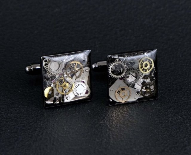 Niesamowite spinki do mankietów w stylu steampunk :) Piękna metalowa oprawa w kolorze czarnym i zatopione w żywicy zegarkowe różności. Wymiary 1,7 x 1,7 cm.