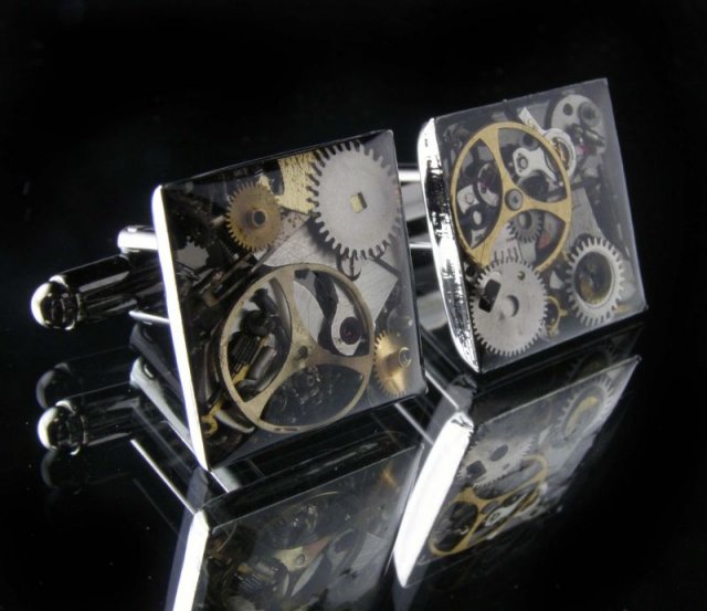 Niesamowite spinki do mankietów w stylu steampunk :) Piękna metalowa oprawa w kolorze czarnym i zatopione w żywicy zegarkowe różności. Wymiary 1,7 x 1,7 cm.