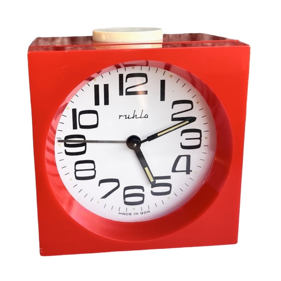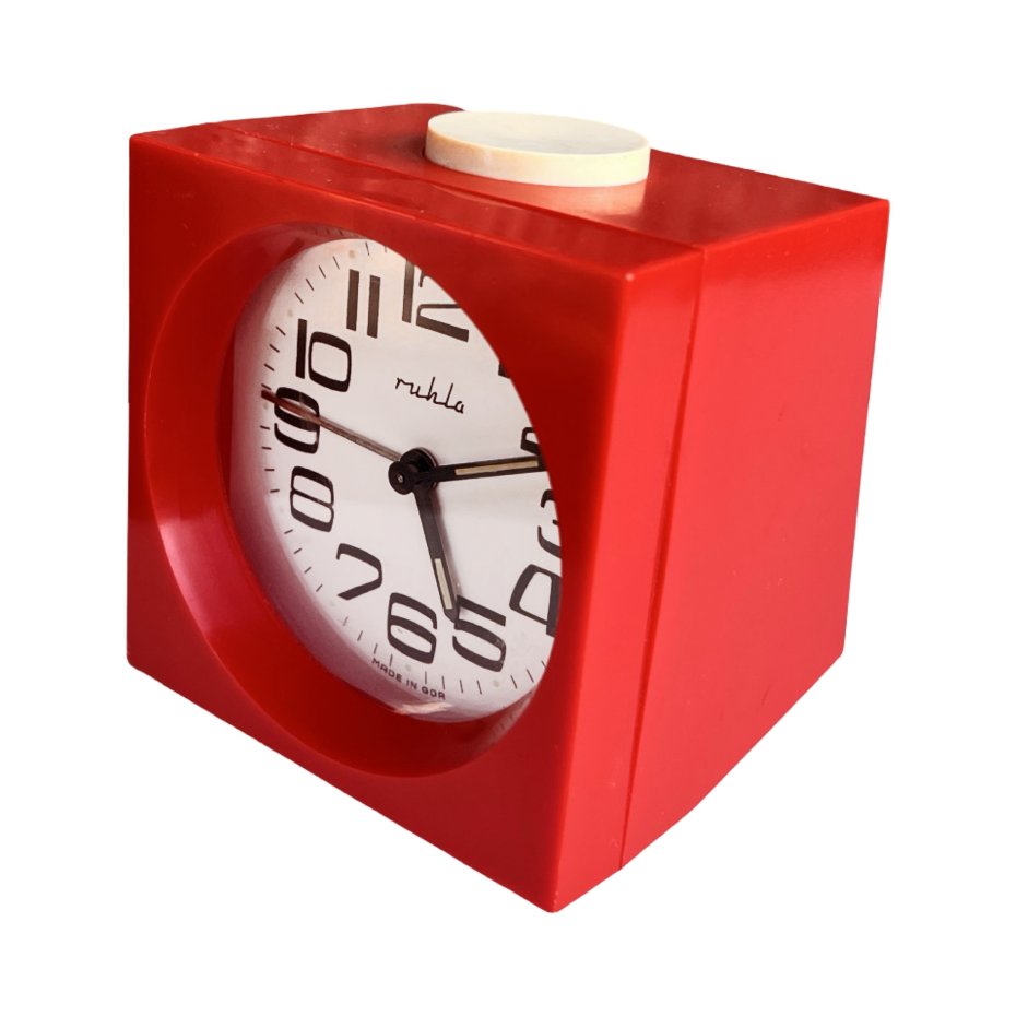 Oryginalny budzik Ruhla wyprodukowany w Niemieckiej Republice Demokratycznej (NRD). Kultowy przykład wschodnioniemieckiego wzornictwa lat 70. – prosty, funkcjonalny i niezwykle efektowny wizualnie.