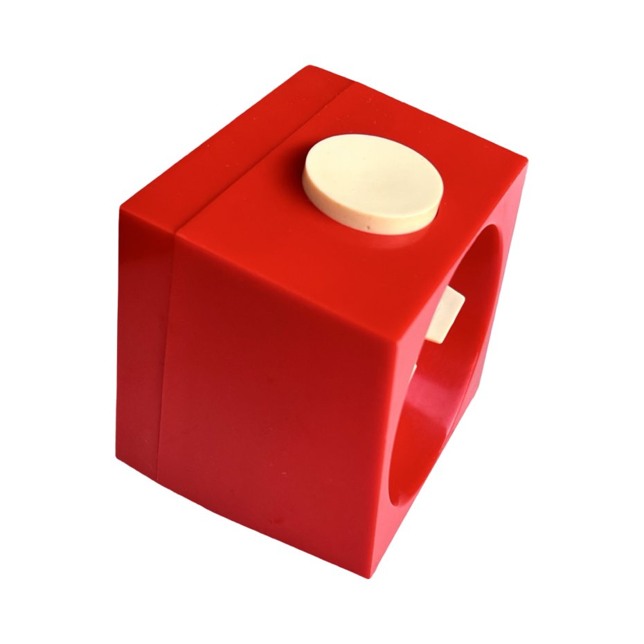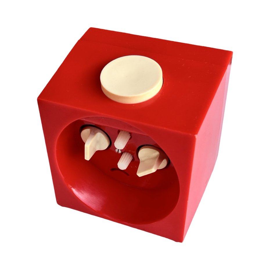 Korpus wykonany z czerwonego tworzywa sztucznego o geometrycznej formie, z dużą i czytelną tarczą. Czarne cyfry i wskazówki z żółtymi akcentami świetnie kontrastują z białym tłem. U góry klasyczny, kremowy przycisk alarmu.