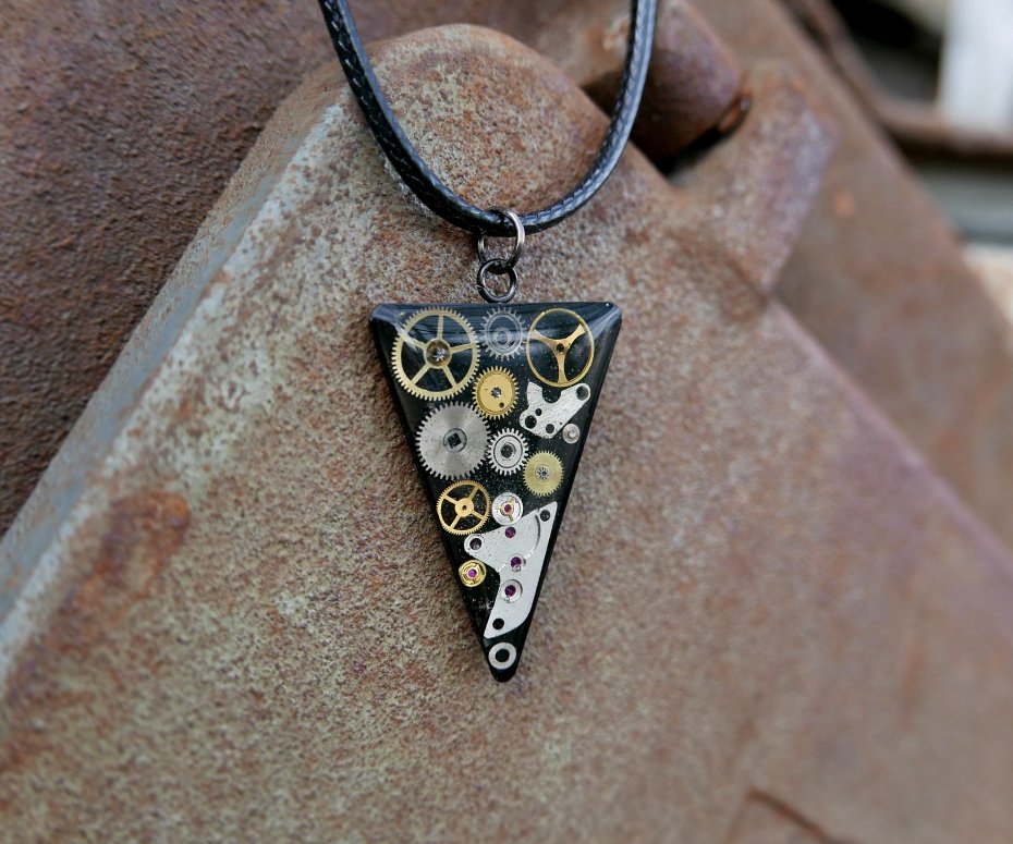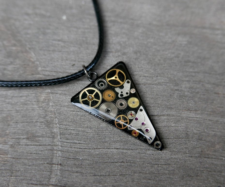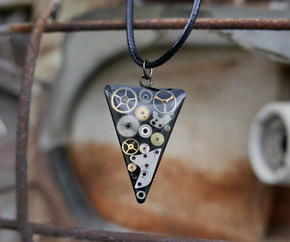 Geometryczny naszyjnik z metalu, emalii i zatopionych w żywicy zegarkowych różności. Wymiary zawieszki 3 x 2 cm. Długość sznurka - ok 46 cm.