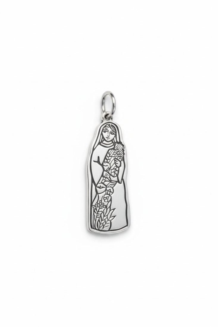 Medalik (bez łańcuszka) wykonany ze srebra pr. 925, długość 2,5 cm, polerowany. Wzór inspirowany rzeźbą ludową, doskonały na prezent na Chrzest, Komunię lub narodziny dziecka. Na rewersie medalika umieszczony jest imiennik i numerator.
