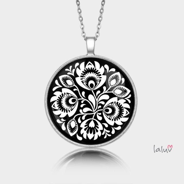 Ręcznie robiony medalion z wysokiej jakości grafiką zamkniętą pod wypukłym szkiełkiem i oprawioną w bazę w kolorze srebrnym.
