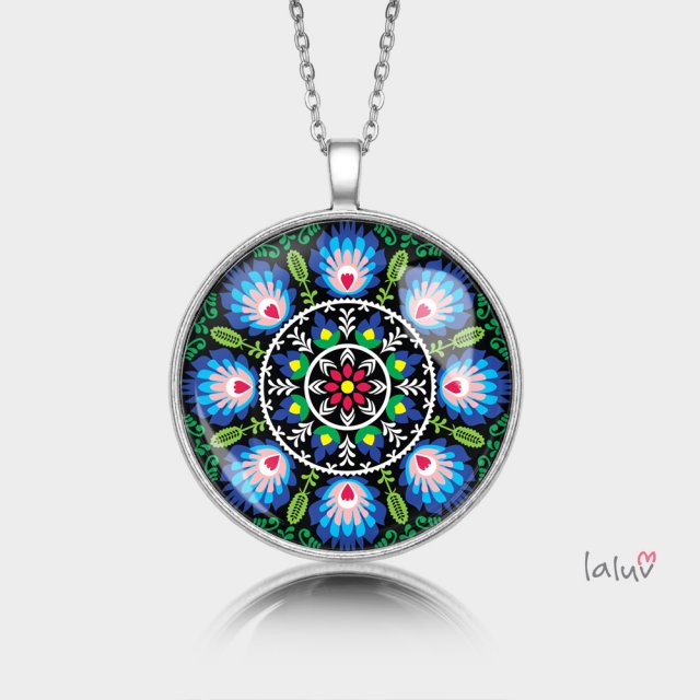 Ręcznie robiony medalion z wysokiej jakości grafiką zamkniętą pod wypukłym szkiełkiem i oprawioną w bazę w kolorze srebrnym.