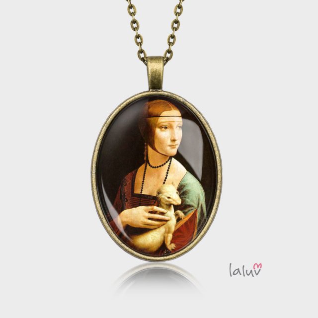 Ręcznie robiony medalion z wysokiej jakości grafiką zamkniętą pod wypukłym szkiełkiem i oprawioną w bazę w kolorze antycznego złota.