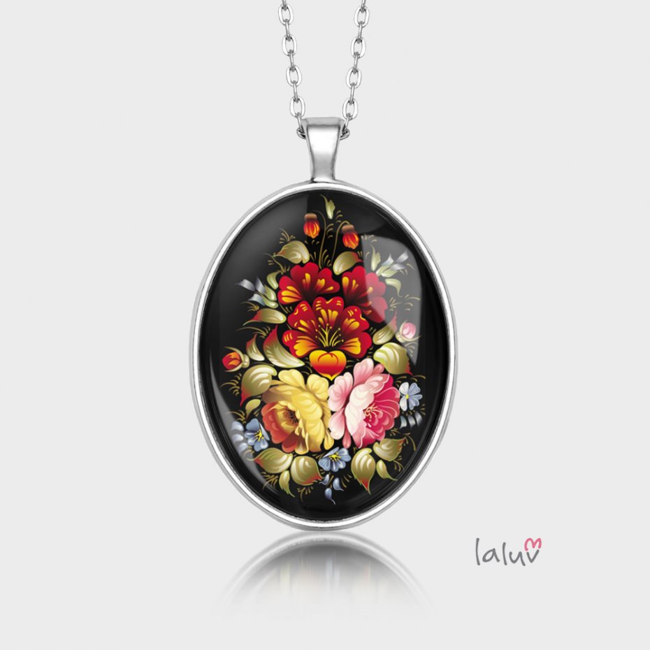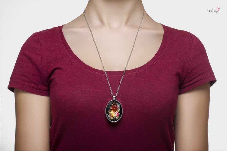 Ręcznie robiony medalion z wysokiej jakości grafiką zamkniętą pod wypukłym szkiełkiem i oprawioną w bazę w kolorze srebrnym.