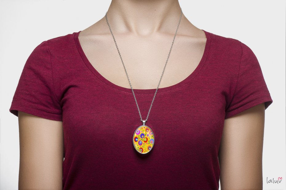 Ręcznie robiony medalion z wysokiej jakości grafiką zamkniętą pod wypukłym szkiełkiem i oprawioną w bazę w kolorze srebrnym.