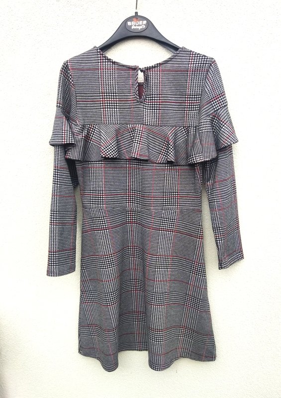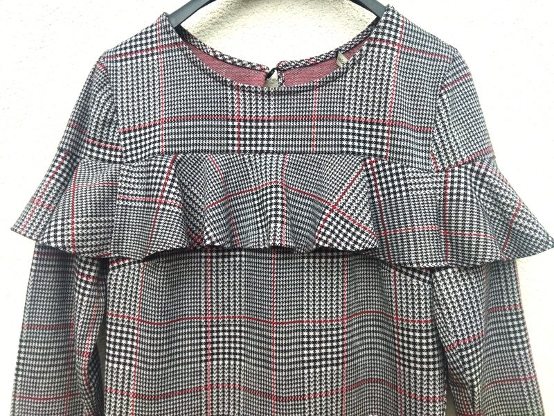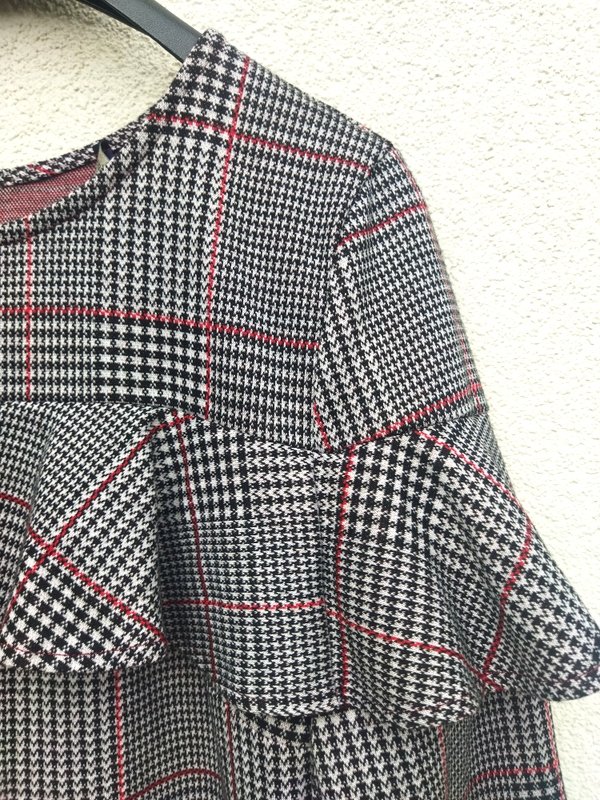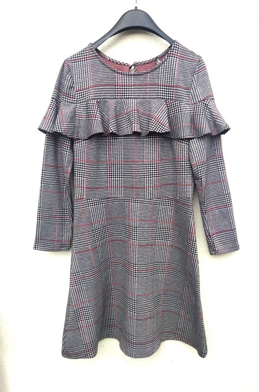 Sukienka z miłej dzianinowej tkaniny poliestrowo-wiskozowej z wzorem w czarno- białą pepitkę i czerwoną kratkę. Odcinana w pasie, góra dopasowana z karczkiem obszytym dookoła włącznie z rękawami falbaną, dół trapezowy. zapinana na plecach na guziczek . Bez podszewki