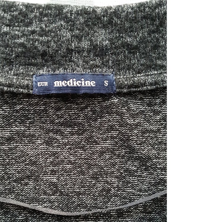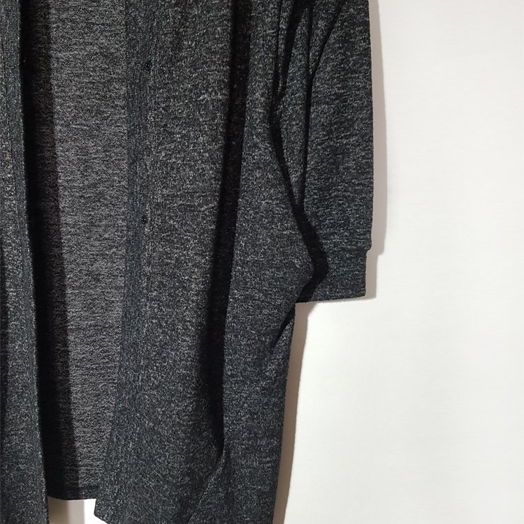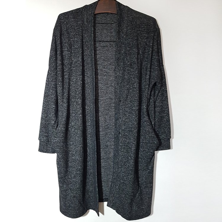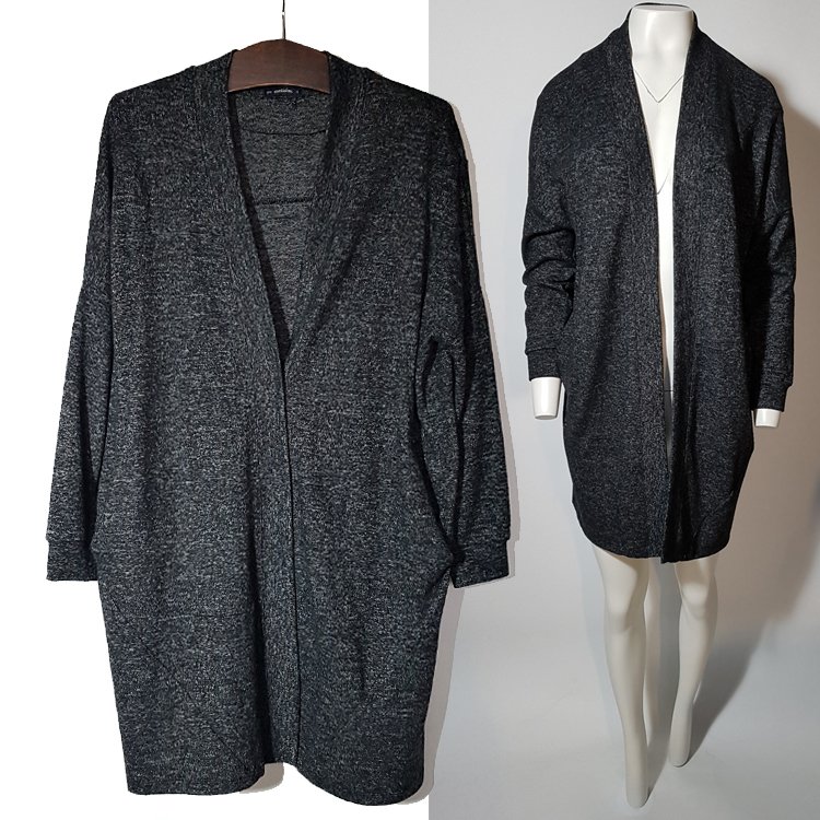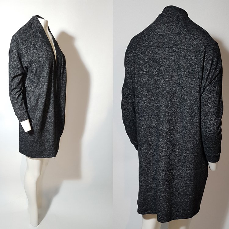 Wdzianko na zatrzaski, wykonane z grafitowej melanżowej dzianiny, rękawy długie o obniżonej linii ramion, po bokach kieszenie. Zapinany na dwa zatrzaski. Może pełnić rolę wiosenno/letniego okrycia.