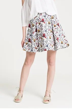 Biała spódnica o kloszowanym kroju, ozdobiona subtelnym, kwiatowym wzorem. Wykonana z przewiewnej tkaniny bawełnianej z dodatkiem elastanu, dzięki czemu ładnie układa się na sylwetce i jest wygodna w noszeniu.