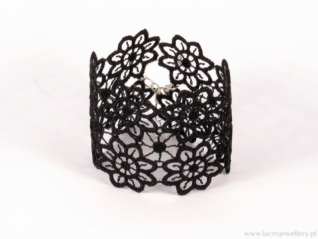 Kobieca bransoletka koronkowa w formie czarnych kwiatów. Ręcznie wykonana, usztywniona tak aby zachowała odpowiedni kształt i była odporna na zanieczyszczenia, wodę, pot itp. Zapinana jest na łańcuszek, który zakończony jest koralikiem. Idealna na wiosnę. Dostępna także w kolorze szarym, ecru i białym.