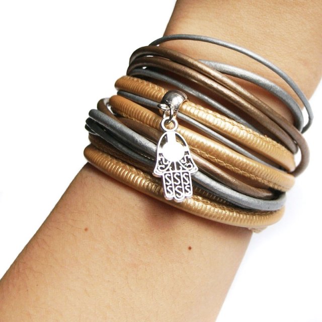 absolutnie zjawiskowa i wyjątkowa bransoletka wykonana mixu rzemieni w metalicznych odcieniach (odcienie srebra i złota): rzemienie 3 i 2mm ze 100% skórki naturalnej oraz szytych-ekologicznych (5mm) i przekładki (HAMSA) w kolorze srebra. ciekawe, wygodne i ozdobne zapięcie typu dziurka-haczyk (widoczne na ostatnim zdjęciu)... HAMSA (RĘKA FATIMY) -dłoń dobrych, sprawiedliwych uczynków, chroni przed złem i chorobami, niesie szczęście i radość.... serdecznie polecam!!! ... pasuje na standardowy nadgarstek ok.15-16cm... ZOBACZ CAŁĄ KOLEKCJĘ!!! ... MOJA BIŻU ZAWSZE PODRÓŻUJE bezpiecznie i OZDOBNIE ZAPAKOWANA ;-) ...