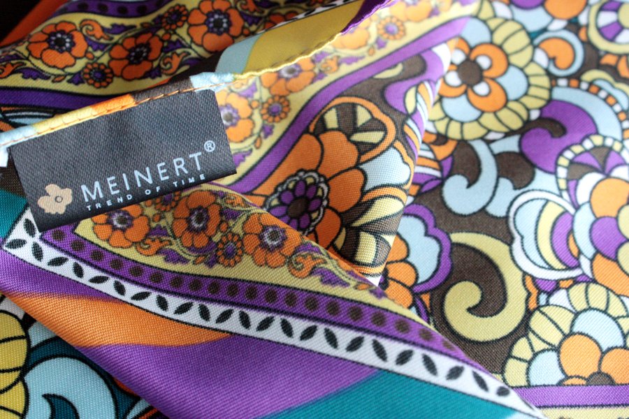 Wielobarwna chusta marki MEINERT. Niska cena jest spowodowana drobnym uszkodzeniem materiału widocznym na ostatnim zdjęciu. Ze względu na mocną kolorystykę i wzory nie jest to widoczne podczas noszenia.