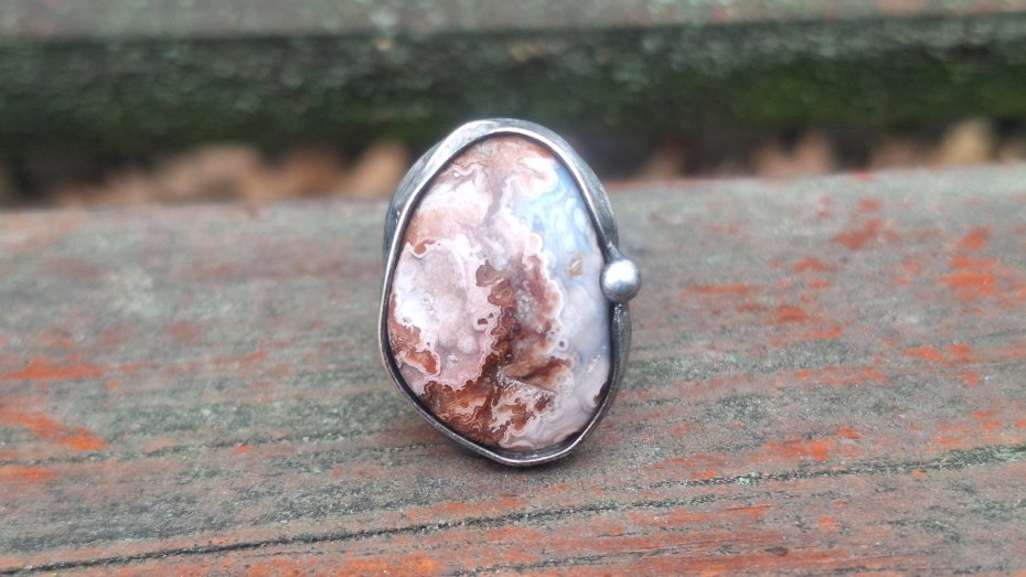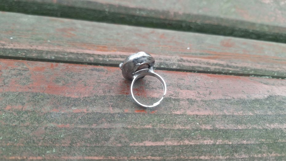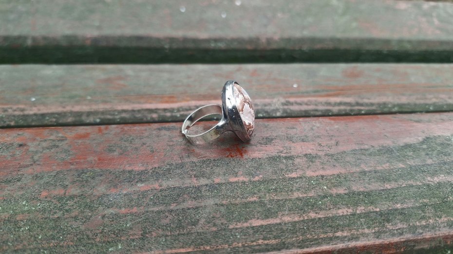 Pierścionek wykonany z miedzi, cyny i agatu meksykańskiego. Wymiary ok. 2.4 na 2 cm. Regulowany. Nie jest ciężki.