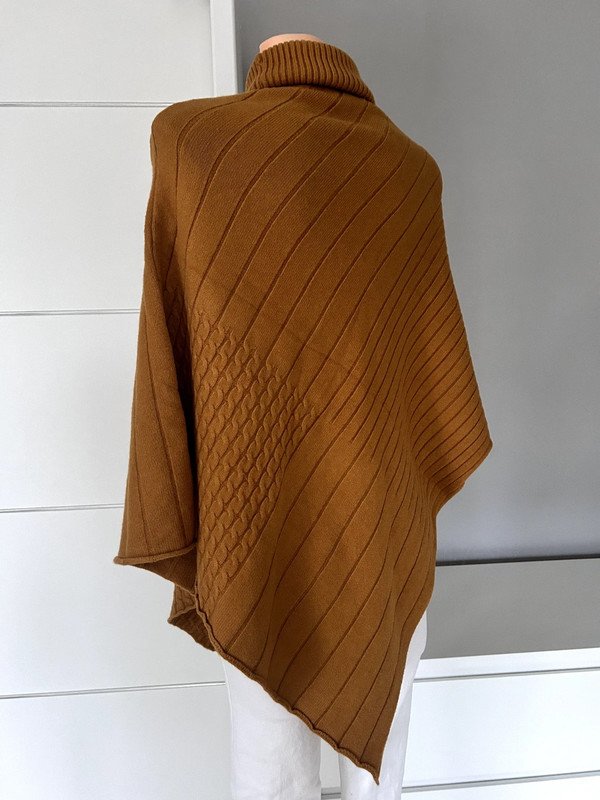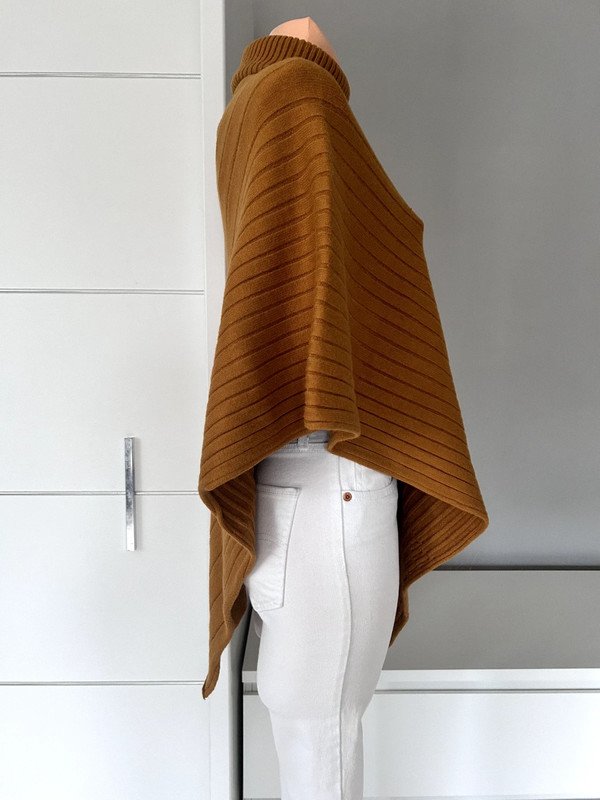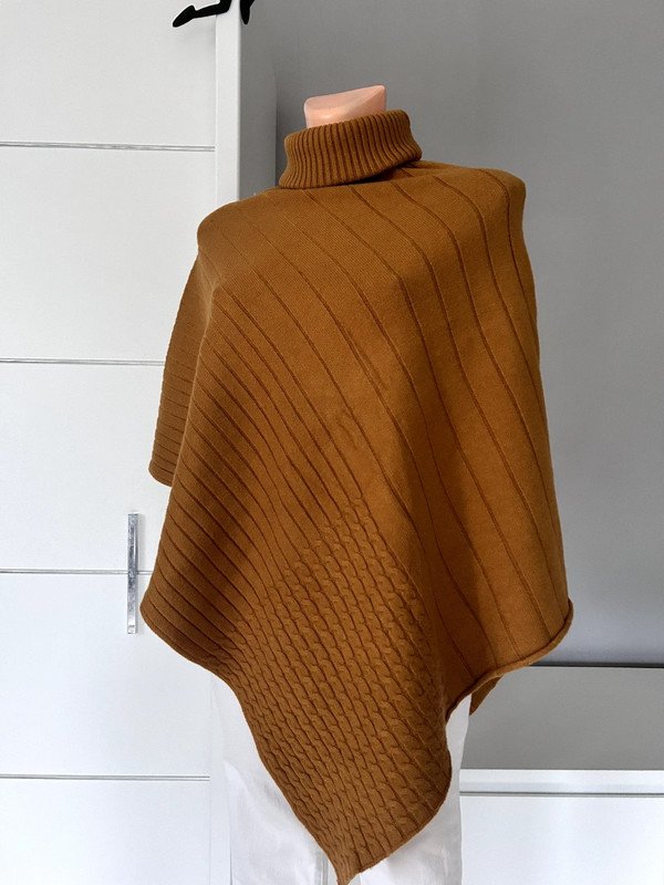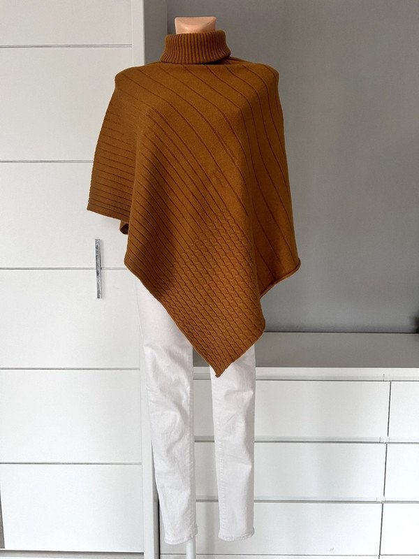 Asymetryczne ponczo marki Melody, rozmiar z metki to 36 S/M 38. Materiał jest bardzo przyjemny i miękki w dotyku. Skład to 45% kaszmiru, 35% wełny i 20% wiskozy. Jest bardzo ciepły.