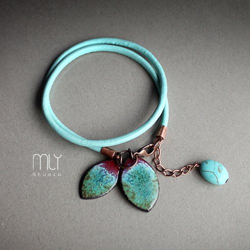 Efektowna bransoletka wykonana z rzemienia jubilerskiego, elementów w kolorze miedzi i ręcznie wykonanej ceramicznej zawieszki, szkliwionej różowym i zielonym szkliwem, Obwód regulowany, długość elementu ceramicznego ok 2,2cm. Polecam . Termin realizacji zamówienia to 1-2 dni.