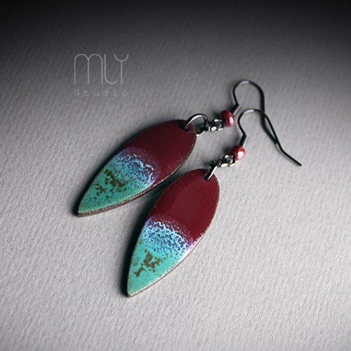 Oryginalne i efektowne ceramiczne kolczyki w formie gronek, ręcznie wykonane z gliny kamionkowej, jednostronnie szkliwione mieszanką zielonych i coemnoróżowych szkliw z efektem drobnych plamek, na biglach w kolorze ciemnego srebra. Długość około 5cm. Polecam