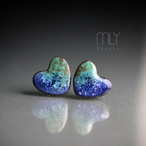 Ceramiczne okrągłe kolczyki w formie sztyftów, ręcznie wykonane z delikatnej czekoladowobrązowej gliny kamionkowej, jednostronnie szkliwione mieszanką zielonych i błękitnych szkliw z efektem plamek, na antyalergicznych sztyftach w kolorze srebrnym. Średnica ok. 11mm.