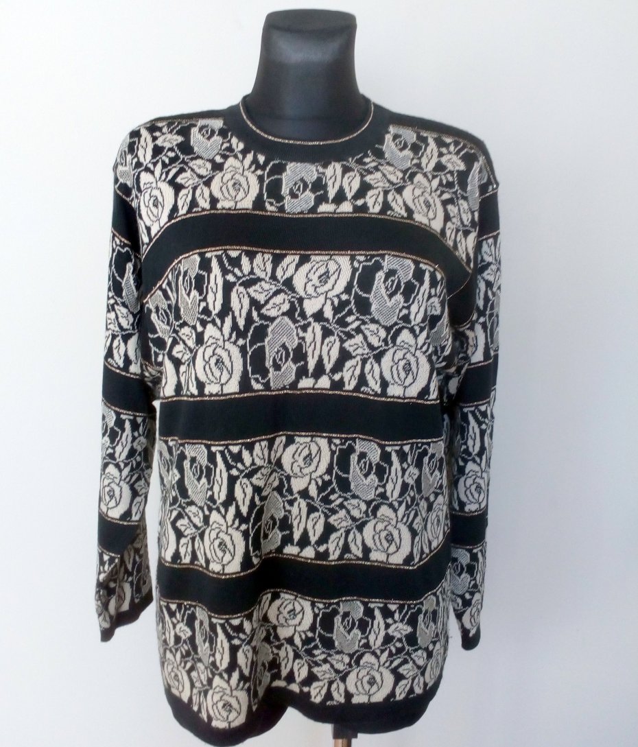 Elegancki sweter w kolorze czarnym i beżowym, z dodatkiem złotej nitki