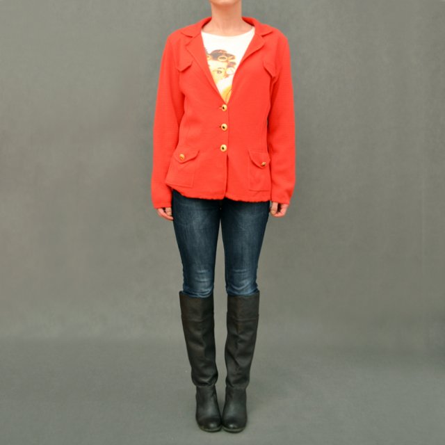 Dzianinowy żakiet w koralowym kolorze wykonany w 100% z wełny merynosów. Zapinany na złote, zdobione guziki. Na ramionach poduszki, na łokciach odrysowane łaty. Nic nie gryzie. Perełka vintage, włoska robota.