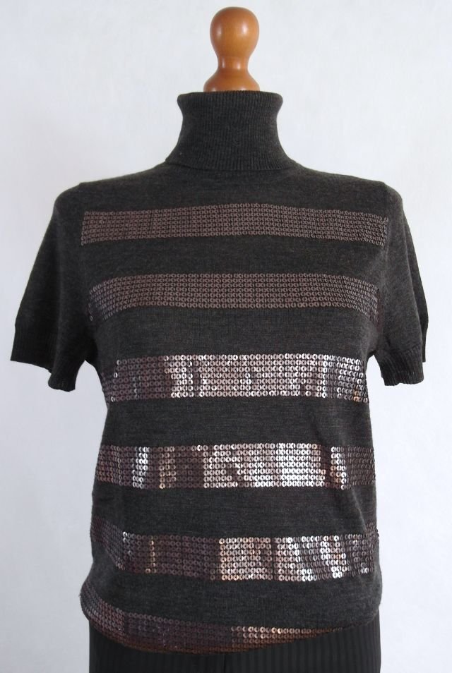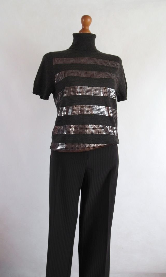 kolor brązowy w pasy z matowych cekinów.efektowny, elegancki jako baza pod marynarkę.stan idealny.bardzo przyjemny w dotyku.