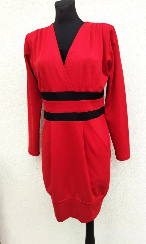 Sukienka z masywnej bawełniano - wiskozowej tkaniny dzianinowej w kolorze nasyconej czerwieni. Odcinana w pasie , góra kopertowa połączona czarną wstawką, z zakładkami na ramionach, talia podkreślona wszytym paskiem z czarnymi wstawkami, dół ołówkowy z dwiema zakładkami po jednej z każdego boku , z dwiema wpuszczanymi kieszeniami, dołem ujęty w szerszą podwójną plisę .
