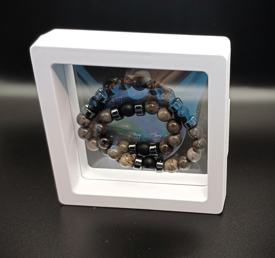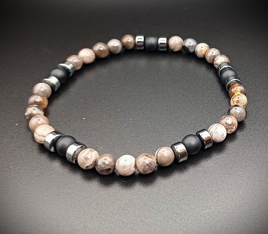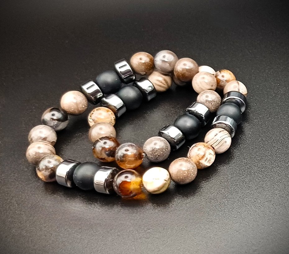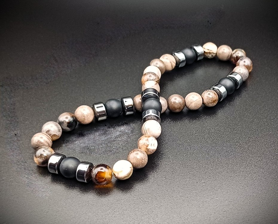 Męska bransoletka ręcznie robiona z naturalnych kamieni agatu, hematytu i czarnego onyksu.