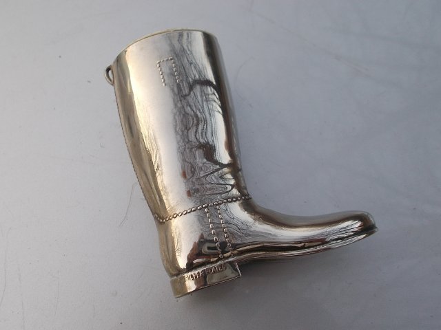 Srebrzona Miarka do Whisky. Typowo angielska rzecz kolekcjonerska do Pubu,lub domowej Kolekcji. Sygnowana GRENADIER ENGLAND SILVERPLATED. Rzadko spotykana w Polsce to rzecz. Bardzo precyzyjne odwzorowanie oficerskiego buta z uchwytem do zawieszenia; Wewnątrz wypełnienie z twardej plasticzanej masy z zapisem APPROX I. 02