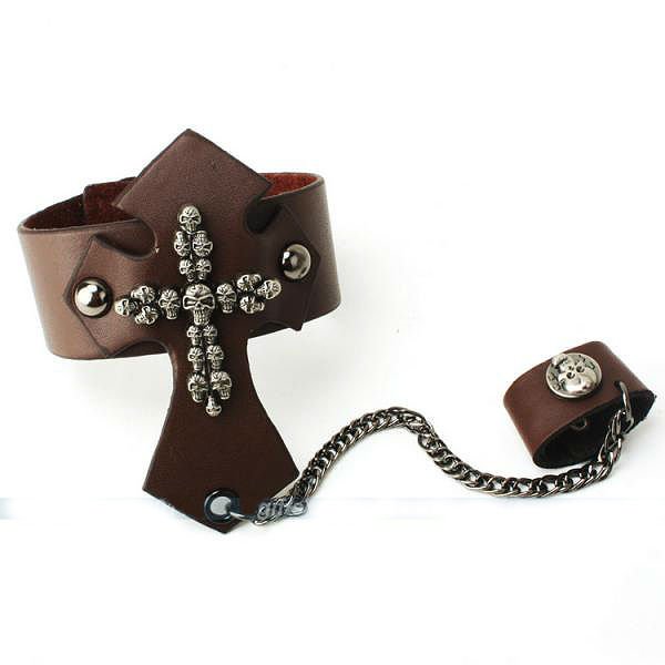 Szeroka bransoleta z brązowej skóry naturalnej z dużym krzyżem. Zdobiona elementami z oksydowanego stopu metali w ciemno srebrnym kolorze. Połączona łańcuszkiem ze skórzana obrączką.