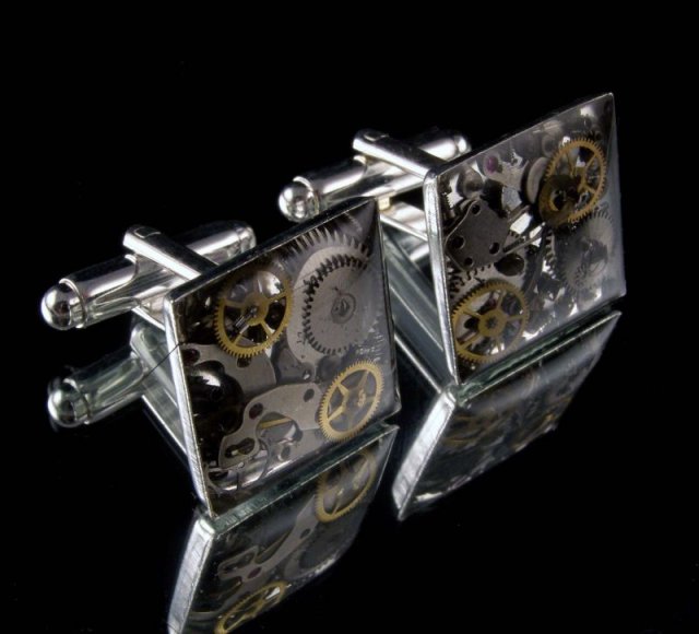Niesamowite spinki do mankietów w stylu steampunk :) Piękna metalowa oprawa w kolorze srebrnym i zatopione w żywicy zegarkowe różności. Wymiary 1,7 x 1,7 cm.