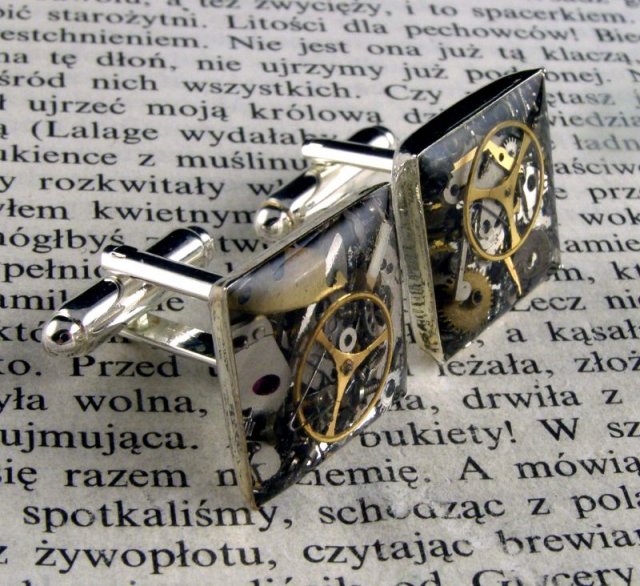 Niesamowite spinki do mankietów w stylu steampunk :) Piękna metalowa oprawa w kolorze srebrnym i zatopione w żywicy zegarkowe różności. Wymiary 1,7 x 1,7 cm.