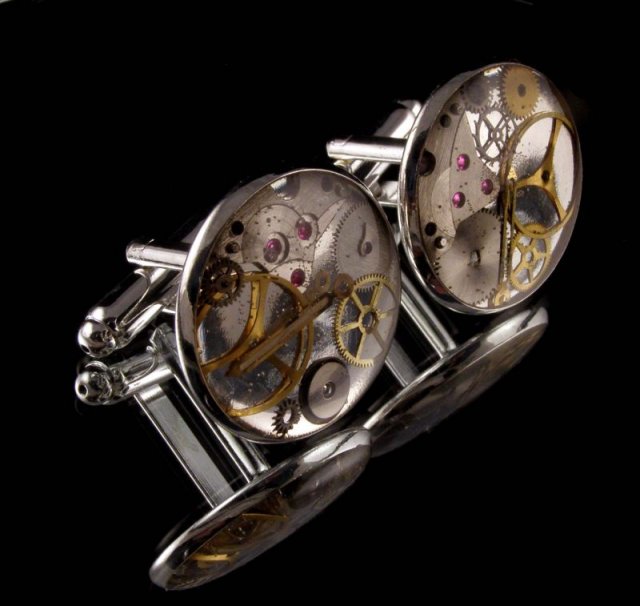 Niesamowite spinki do mankietów w stylu steampunk :) Piękna metalowa oprawa w kolorze srebrnym i zatopione w żywicy zegarkowe różności. Średnica 2,2 cm.