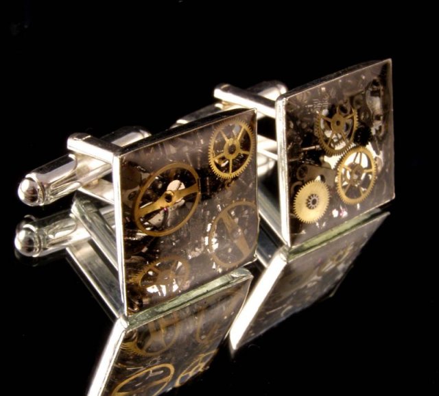 Niesamowite spinki do mankietów w stylu steampunk :) Piękna metalowa oprawa w kolorze srebrnym i zatopione w żywicy zegarkowe różności. Wymiary 1,7 x 1,7 cm.