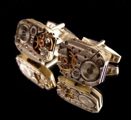 Eleganckie spinki do mankietów w stylu steampunk :) Wykonane z pięknych, oryginalnych mechanizmów zegarkowych z rubinowymi śrubeczkami i baz ze srebra. Wysokość mechanizmów - 1,8 cm, szerokość - 1,4 cm.