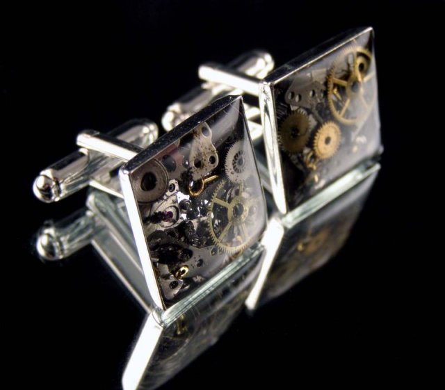 Niesamowite spinki do mankietów w stylu steampunk :) Piękna metalowa oprawa w kolorze srebrnym i zatopione w żywicy zegarkowe różności. Wymiary 1,7 x 1,7 cm.