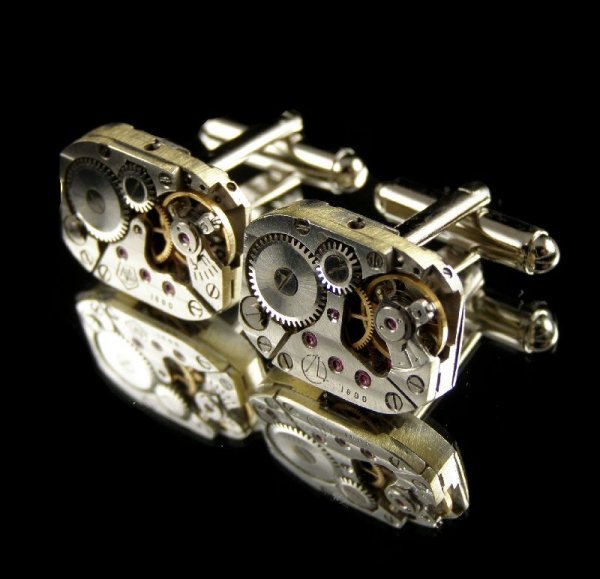 Eleganckie spinki do mankietów w stylu steampunk :) Wykonane z pięknych, oryginalnych mechanizmów zegarkowychw kolorze oksydowanego srebra z rubinowymi śrubeczkami i metalowych baz. Wysokość mechanizmów - 1,8 cm, szerokość - 1,4 cm.