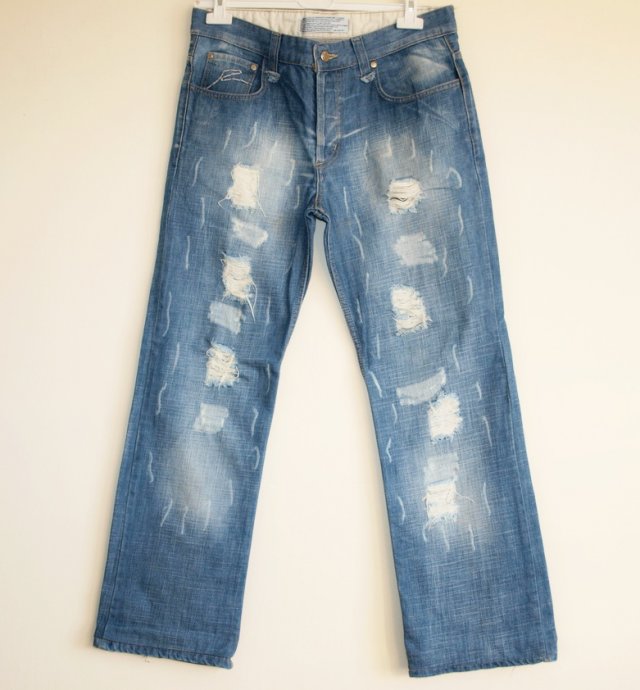Męskie spodnie marki Zara fabrycznie przecierane i dziurawione. Rozmiar 34. Stan określiłabym jako bardzo dobry-. Minus za minimalne przybrudzenia i przetarcia na dole nogawek pokazane na zdjęciu. Mam podejrzenie że były skracane, ale jeśli tak to bardzo profesjonalnie.