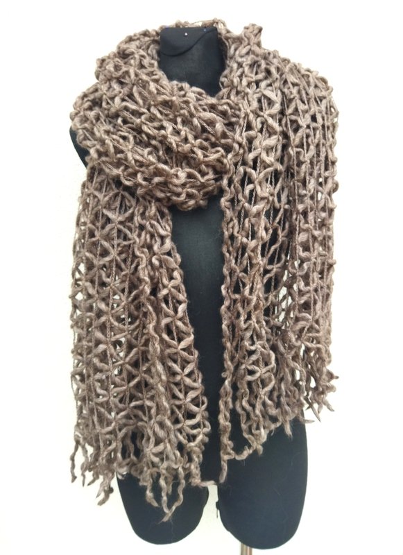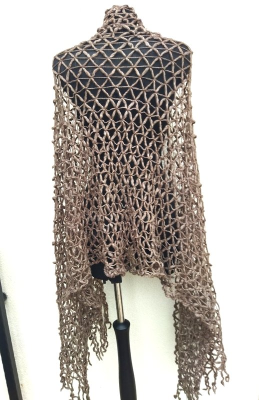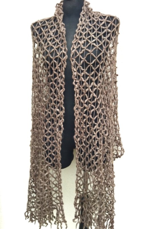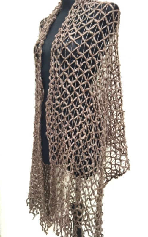 Wspaniały miły niegryzący ażurowy szal w brunatnym kolorze. Z frędzlami.
