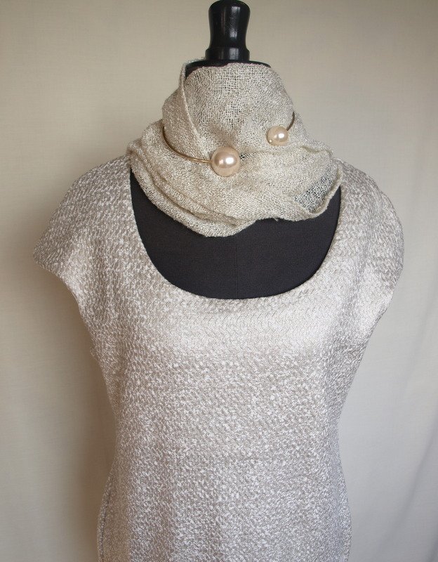Ciekawa sukienka z grubszej bawełny o porowatej strukturze, co w połączeniu z metalicznym nabłyszczeniem daje bardzo fajny efekt. Bawełna jest w kolorze ecru, nabłyszczenie w kolorze oliwkowo-złotym.