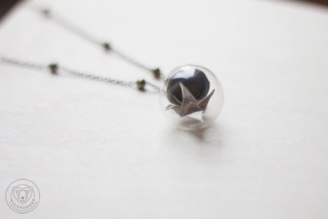 Delikatny, maleńki, papierowy żuraw - japoński symbol szczęścia, zdrowia i pokoju. Podobno, jeśli w jakiejś intencji złoży się tysiąc żurawich figurek, to życzenie się spełni. My spełniamy życzenia tym zjawiskowym wisiorkiem. Papierowy żuraw ukryty w szklanej kuleczce o najszerszej średnicy 2 cm. Część ozdobna zawieszona na łańcuszku o długości 36 cm. Całość w kolorze starego złota/brązu.